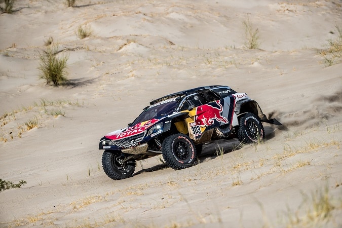 4eme de l’étape / 2eme au général. » Nous avons sauté une dune, la 1ère du rallye, ce qui nous a mis une sacrée secousse. Nos cervicales ont souffert. Je crois qu’il me manque une vertèbre… La direction de la 3008DKR a également été touchée par le choc. La navigation était compliquée en ouvrant la route. Ce n’était vraiment pas facile. Nous nous sommes relayés avec le premier motard pour trouver la bonne trace. Les pneus BF Goodrich sont hyper résistants. Quand je vois la vitesse à laquelle on roule dans les épineux avec notre PEUGEOT 3008DKR Maxi, c’est incroyable que l’on ne crève pas. »