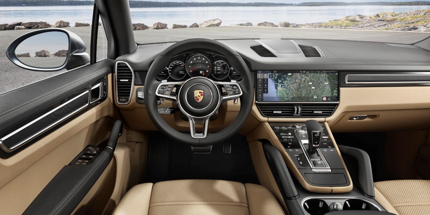 Le Cayenne nouvelle génération ouvre un nouveau chapitre dans l’interaction entre le conducteur et sa voiture grâce au Porsche Advanced Cockpit, un système de commande et d’affichage harmonieusement intégré à un habitacle qui marie sportivité et exclusivité. Au coeur de ce nouveau système se trouve un écran tactile de 12,3 pouces haute définition (en Full HD) de la dernière génération du Porsche Communication Management (PCM), dévoilée l’an dernier à l’occasion du lancement de la nouvelle Panamera. Le PCM bénéficie d’une grande variété de fonctionnalités et d’une interface particulièrement intuitive complétée par une fonction de commande vocale. Le système Porsche Connect Plus, de série, fournit un accès Internet et donne accès à différents services en ligne, dont la navigation en ligne avec information trafic en temps réel, également de série. Outre les commandes analogiques permettant d’activer les principales fonctions de la voiture, la nouvelle console centrale comprend une surface tactile présentant un aspect verre, similaire à celle d’un smartphone, à laquelle sont harmonieusement intégrées diverses touches sensitives dotées d’une fonction de retour auditif et tactile. Fidèle à la tradition Porsche, le tableau de bord fait la part belle au compte-tours analogique qui trône en son centre. Commandés à partir du volant multifonctions, les deux écrans 7 pouces haute définition en Full HD, placés de chaque côté du compte-tours, affichent les données de conduite ainsi que d’autres informations, pouvant être commandés avec la molette du volant multifonctions. Parmi les systèmes d’assistance à la conduite figurent l’assistance à la vision nocturne avec caméra thermique, l’assistance de changement de voie, l’alerte de franchissement de ligne avec détection de la signalisation routière, l’assistance embouteillage, l’assistance parking avec vision 360° et le système Porsche InnoDrive avec régulateur de vitesse adaptatif.