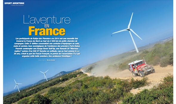 Les participants de Rallye des Pionniers cru 2014 ont une nouvelle fois traversé la France du Nord au Sud via 2 000 km de petits chemins de campagne. Cette 3e édition rassemblait une centaine d’équipages en auto, moto et camion, tous nostalgiques de l’ambiance des premiers Paris-Dakar. Pouvoir contempler une Range Rover Halt’Up, une Renault 20 “Marreau replica” suivies d’un 500 XT Yamaha en enfilade, cap au Sud comme il y a 30 ans, c’était le pari de Pascal François, le patron de l’association T’Lo qui organise cette belle aventure. Une ambiance frénétique !
