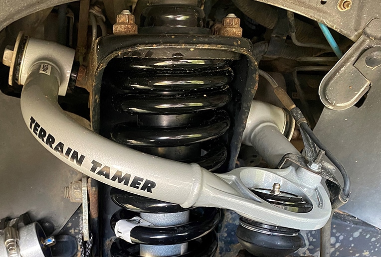 Terrain Tamer triangle suspension – Lors de la rehausse d’un 4×4 à suspensions indépendantes avant, on modifie les valeurs des angles de pivot et de chasse ce qui n’est pas bon pour tenue de cap et freinage. Encore moins pour l’usure des pneus irrégulière.